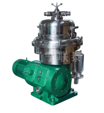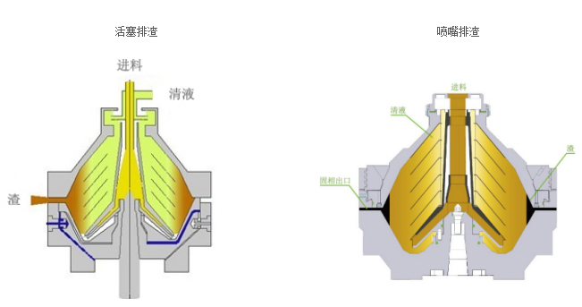 電機(jī)通過(guò)螺旋齒輪副驅(qū)動(dòng)轉(zhuǎn)鼓繞主軸軸線做高速旋轉(zhuǎn),在轉(zhuǎn)鼓內(nèi)形成強(qiáng)大的離心力場(chǎng)。物料由上部中心進(jìn)料管流入轉(zhuǎn)鼓底部,通過(guò)碟片分流孔趨向轉(zhuǎn)鼓壁空間。在離心力作用下,液相沿碟片內(nèi)錐面趨向轉(zhuǎn)鼓壁流動(dòng)至上部的出液口排出。比液相重的固相物沉積向轉(zhuǎn)鼓內(nèi)壁形成沉渣,由排渣裝置自動(dòng)排出機(jī)外或停機(jī)后由人工清除。