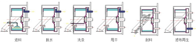 電機帶動皮帶輪驅(qū)動轉(zhuǎn)鼓繞自身軸線高速回轉(zhuǎn),反沖管向虹吸室內(nèi)灌液排除虹吸管內(nèi)的空氣,物料在預(yù)先編制的程序控制下,通過進料系統(tǒng)進入高速旋轉(zhuǎn)的轉(zhuǎn)鼓內(nèi)。在離心力和虹吸抽離的雙重作用下,物料均布在過濾介質(zhì)上進行脫液分離,液相透過固相物料和濾網(wǎng)縫隙,經(jīng)過濾內(nèi)轉(zhuǎn)鼓壁孔和虹吸室的通孔進入虹吸室,再由虹吸管抽走排出機外,固相物料截留在過濾轉(zhuǎn)鼓內(nèi)形成濾餅。料層檢測裝置實時檢測物料的充填位置,當濾餅達到事先設(shè)定的位置時,自動關(guān)閉加料閥,停止進料,然后對濾餅進行洗滌、脫水,待達到要求后,離心機降到卸料速度,卸料閥打開,刮料器在液動控制下旋轉(zhuǎn)上升,將濾餅刮下掉進螺旋出料器,經(jīng)出料閥排出機外。