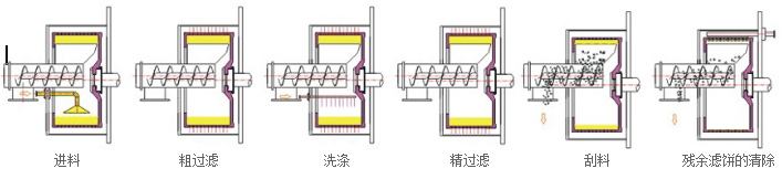 電機帶動皮帶輪驅(qū)動轉(zhuǎn)鼓繞自身軸線高速回轉(zhuǎn),物料在預(yù)先編制的程序控制下,通過進料系統(tǒng)進入高速旋轉(zhuǎn)的轉(zhuǎn)鼓內(nèi)。在離心力的作用下,物料均布在過濾介質(zhì)上進行脫液分離,液相透過固相物料和濾網(wǎng)縫隙,經(jīng)鼓壁孔甩至機殼空間,從出液口排出機外,固相物料截留在轉(zhuǎn)鼓內(nèi)形成濾餅。料層檢測裝置實時檢測物料的充填位置,當(dāng)濾餅達到事先設(shè)定的位置時,自動關(guān)閉加料閥,停止進料,然后對濾餅進行洗滌、脫水,待達到要求后,離心機降到卸料速度,卸料閥打開,刮料器在液動控制下旋轉(zhuǎn)上升,將濾餅刮下掉進螺旋出料器,經(jīng)出料閥排出機外。